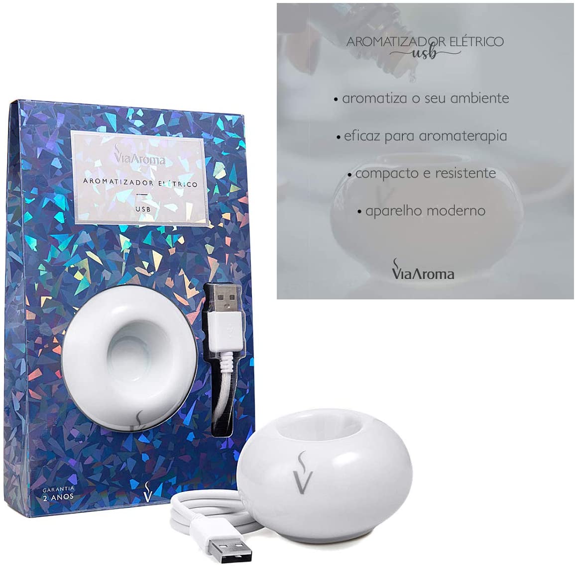 Certificado pelo Inmetro; Feito de porcelana; Cabo USB de 65 cm; Difusor de óleos essenciais e essências; Use em PC, notebook, televisão, etc; Baixo consumo de energia; Temperatura constante