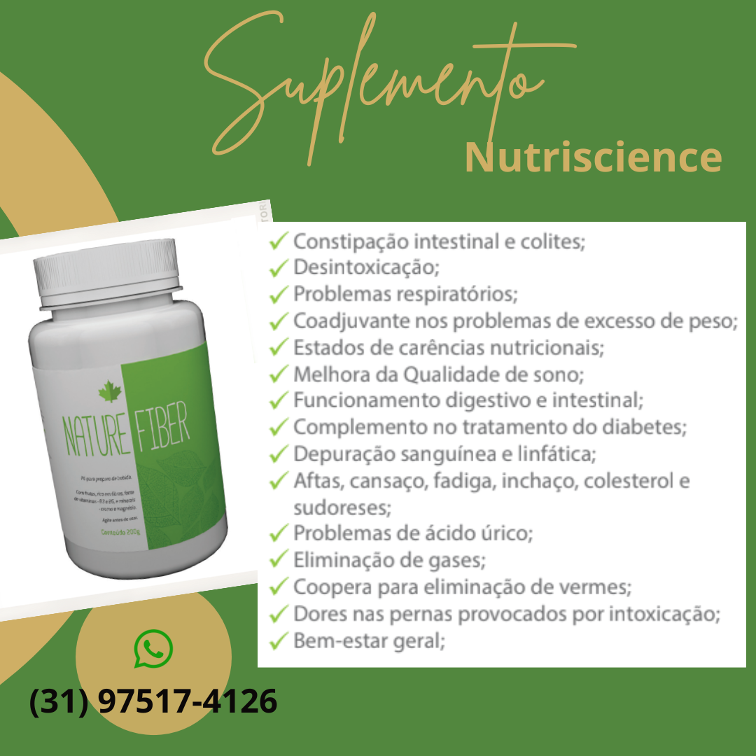 O Nature Fiber da NutriScience, é um suplemento nutricional em pó que combina frutos e fontes de fibras (maçã, ameixa, uva, laranja, limão e mamão – amaranto, linhaça, gengibre – todos em pó), e ainda, a inulina (fibra pré biótica) + vitaminas + minerais.